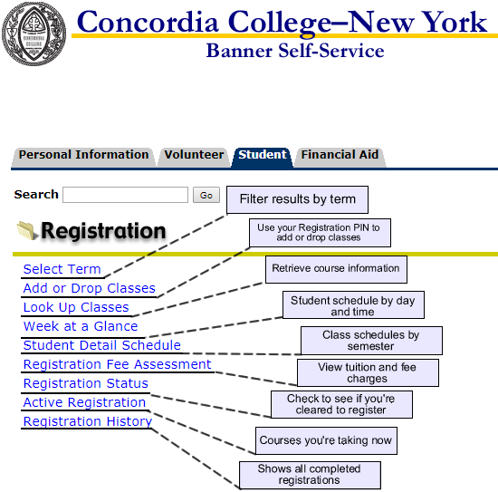 Each selection allows you to view or change parts of your schedule, or see if you have any outstanding fees: