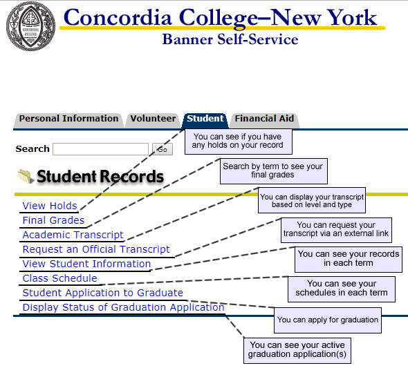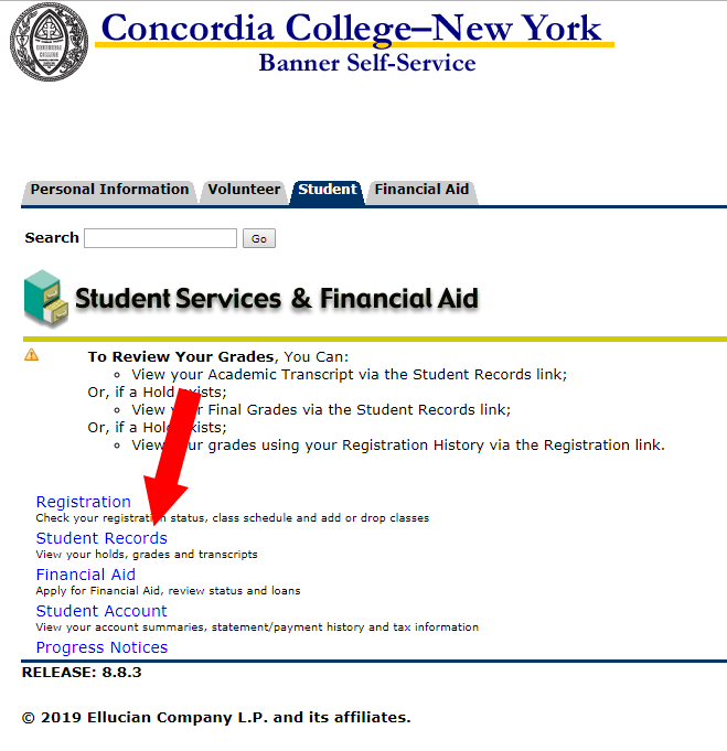 After logging in, click the Student tab. Scroll down and click Student Records: