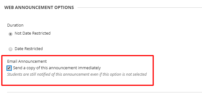 Scroll down once you’re finished with your message and choose your visibility options. If your message isn’t date restricted, be sure to check off “send a copy of this announcement immediately”, otherwise it will go out overnight: