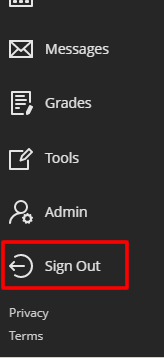 PLEASE BE ADVISED: it is very important that you also log out of Blackboard. If you don’t, you will receive multiple errors the next time you try to log in. To log out, simply go back to your Blackboard home page and click the Sign Out button at the bottom of the menu on the left: