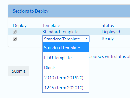 Check off the box next to the course you’d like to deploy. From the drop-down, choose a template. “EDU Template” is for any EDU course, and every other course can use the “Standard Template”: