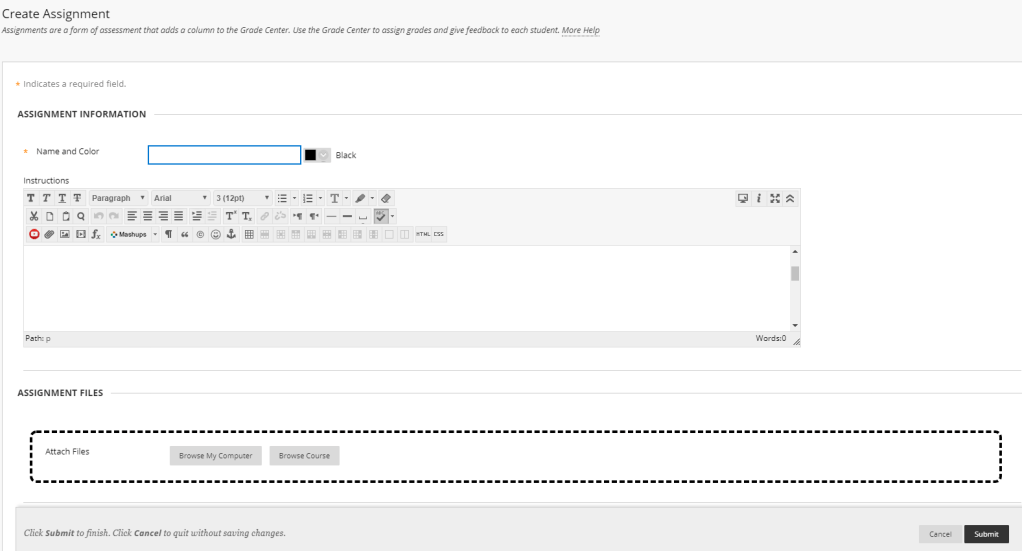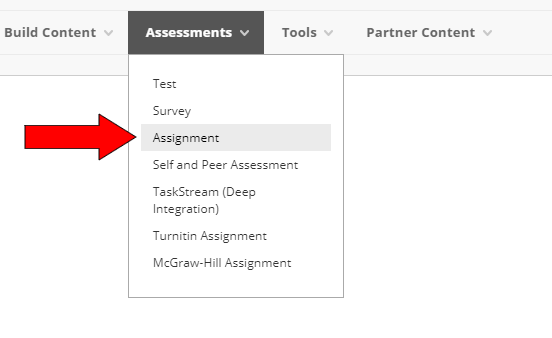 - Open up the Content Area you’d like your assignment to be. From the Assessments menu, select Assignment and fill in the name and instructions. You can also add any files the students may need. You can use the options in the editor to format text and add file, or add files in the Assignment Files section.