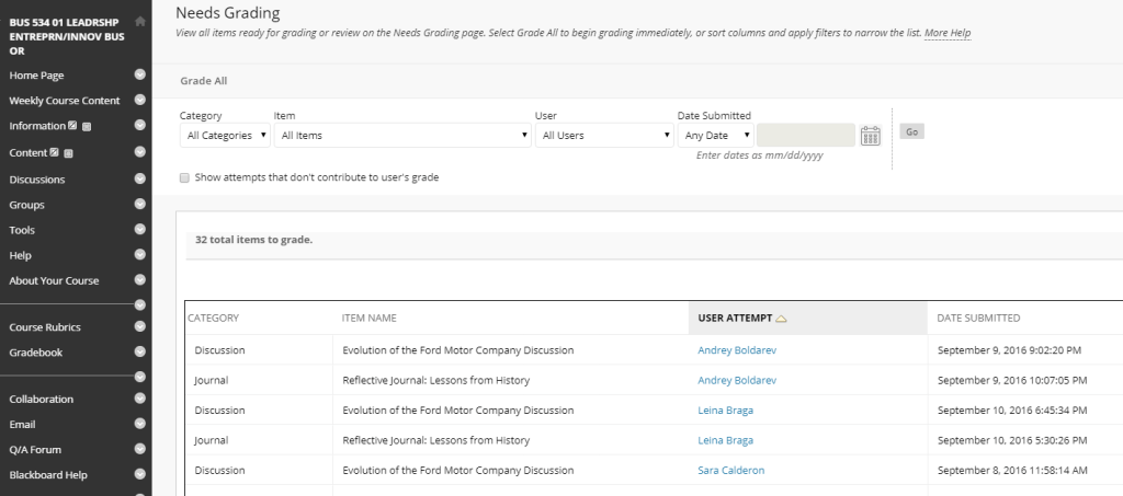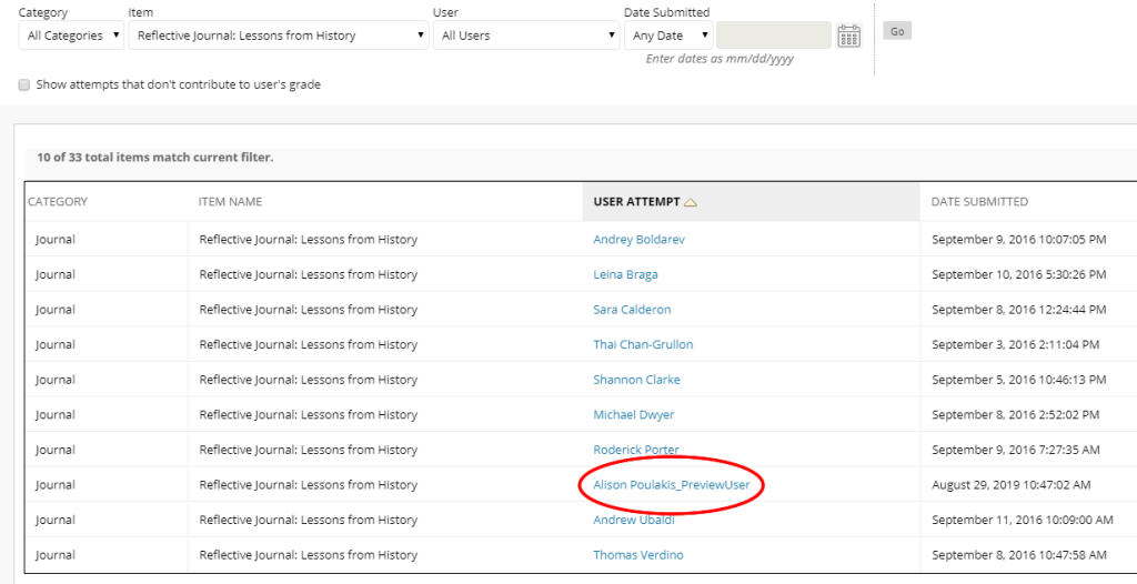 You can sort student submissions by any of the columns below; Category, Item Name, User Attempt, Date Submitted.