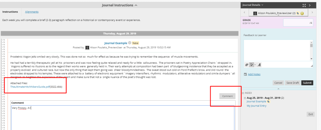Below I’ve selected to see the Reflective Journal Item/Assignment for all students.