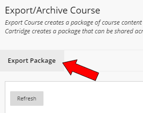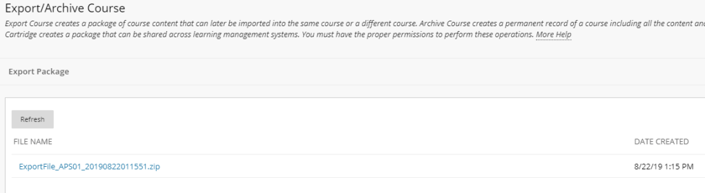 Click Submit. The export may take a few minutes, depending on the size of the course. When it’s ready, you should receive an email. You can also click Refresh to view the package: