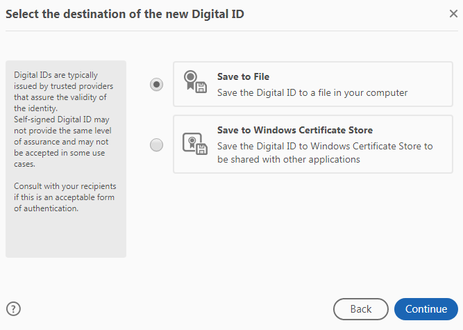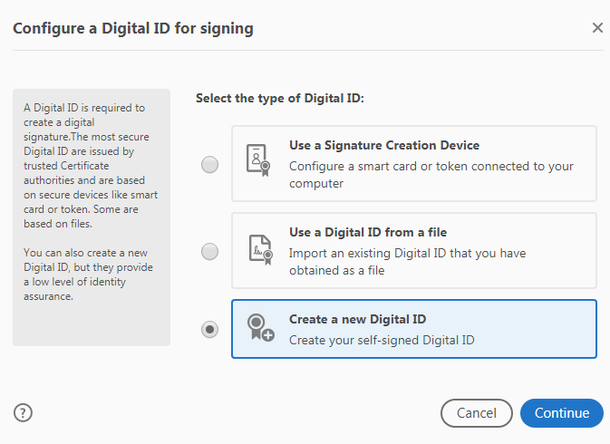 Click “Configure Digital ID”. On the next screen, click Create a New Digital ID if you don’t have an existing Digital ID: