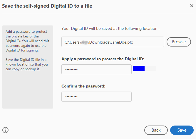 Choose a location to save your signature and add a password. The password should be a mix of numbers and letters. Click Save: